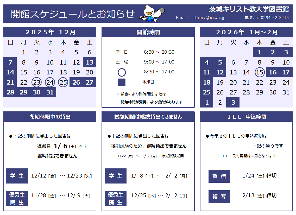 開館スケジュールとお知らせ(2025年12月~2026年2月)