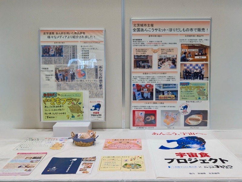 そのような目的の中、主催者が産学連携事業の取り組みで実際に商品・販売されているものを紹介したいということで、本学の「あんこう、宇宙へ。宇宙食プロジェクト」に依頼があり、本プロジェクトで開発した様々な商品や販売時に使用したポップ展示を行い、紹介してまいりました。