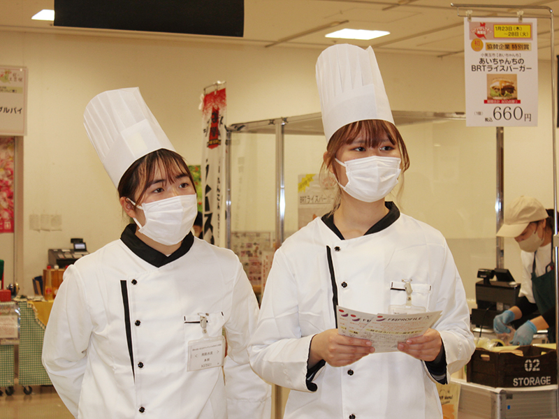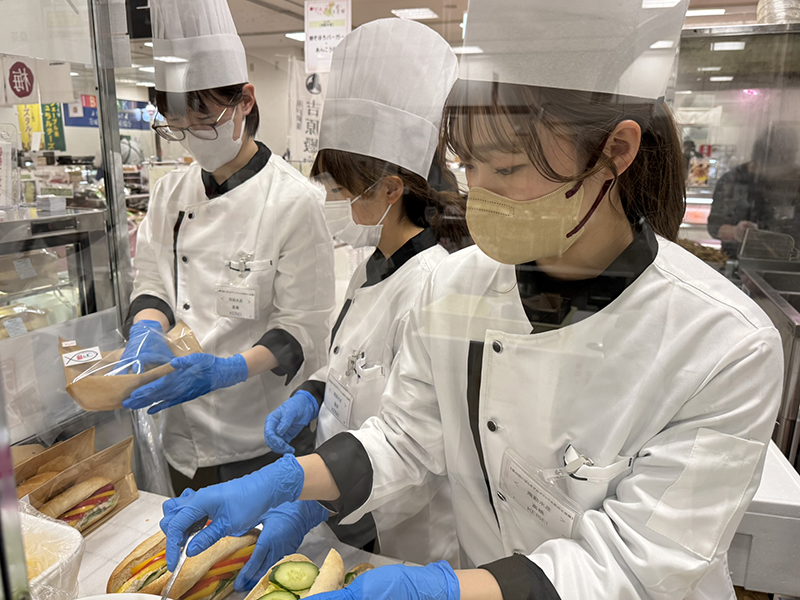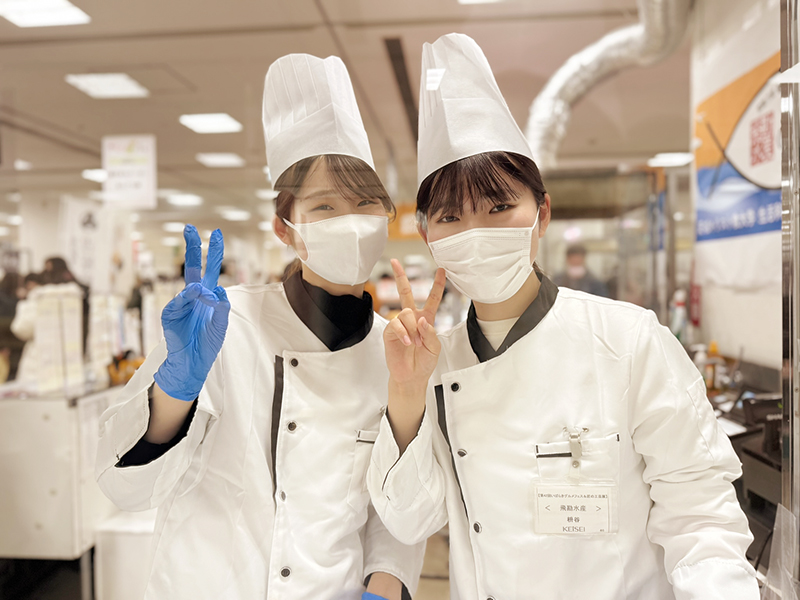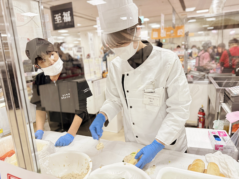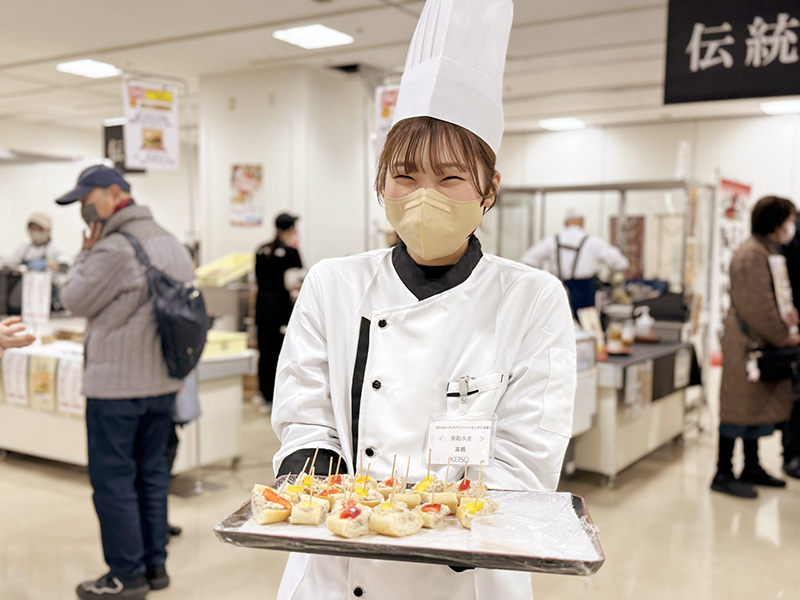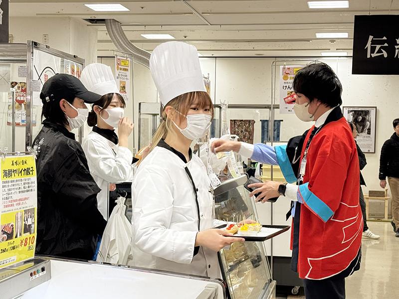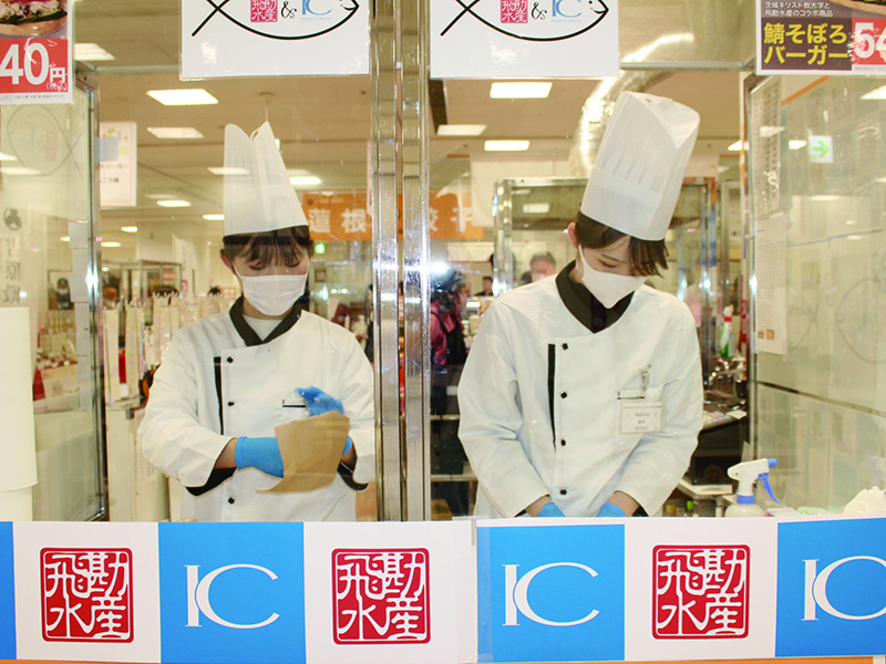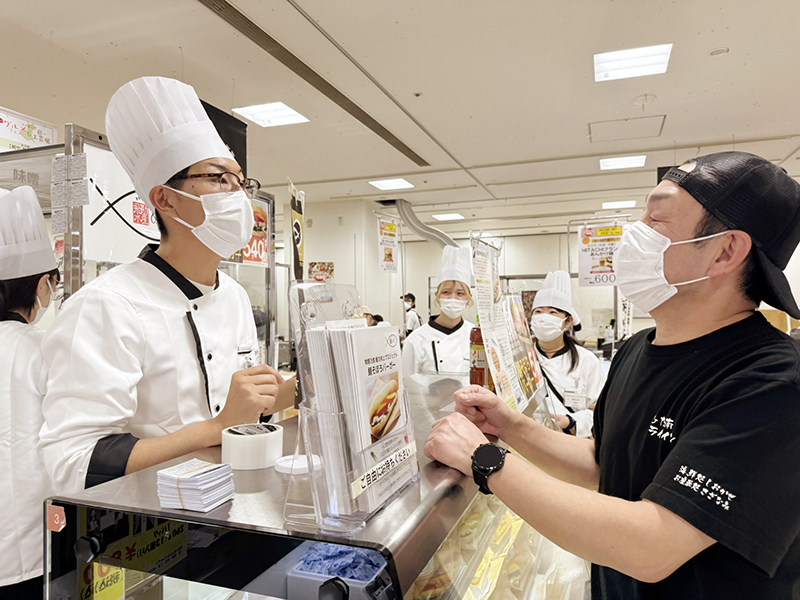 今回新調したコックコートとコック帽を身に付け、ドキドキしながら会場入りをしたところ、参加させていただいた朝礼で「学生たちの活動を応援したい」と、水戸京成百貨店の皆様をはじめとするイベント主催の茨城県観光物産協会の皆様、同じイベント出展者の皆様に温かく迎えていただきました。