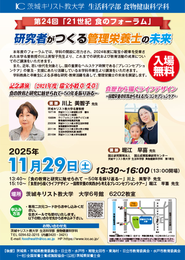 11月29日(土)開催 「研究者がつくる管理栄養士の未来」と題し、お二人の先生からご講演をいただきます。 様々な研究・教育活動を通して、管理栄養士の未来を展望します。 皆様のご参加をこころよりお待ちしております。