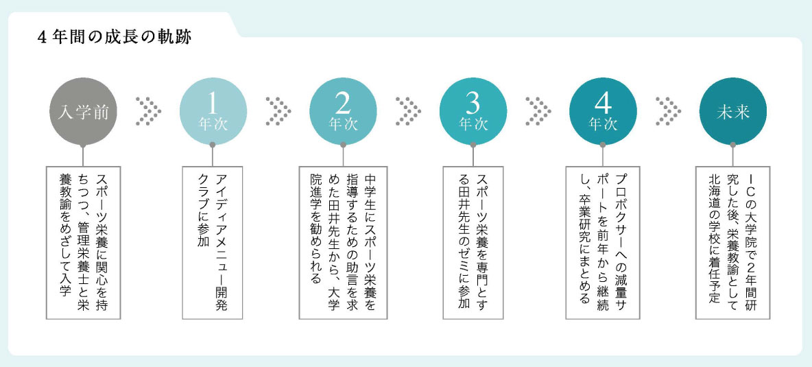 スポーツ栄養に関する学びと研究、管理栄養士をめざす学科の課程と国家試験対策、そして栄養教諭になるための教職課程と教員採用試験対策が、私の学生生活を形づくる3本柱です。3年次からのゼミでプロボクサーの減量サポートに取り組めたことは、在学中に3本柱を集約した貴重な経験に。大学院に進み、修了後は高度な専門性を併せ持つ栄養教諭として、成長期に激しい運動をする児童生徒に栄養指導をしたいと思っています。