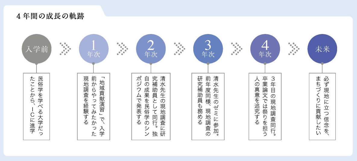 2年次になって清水先生に誘っていただいた、ユネスコ無形文化遺産に登録された祭りの現地調査。山車の引き手に外国人が交じっている様子を不思議に感じた私は、当人たちにインタビューし、その結果を民俗学のシンポジウムで発表しました。3・4年次では、調査する祭りの数を増やし、先生の現地調査に同行。その経験を重ねるなかで実感した、現地で現物を見ることの大切さを、卒業後は地域のまちづくりに生かしていきたいです。