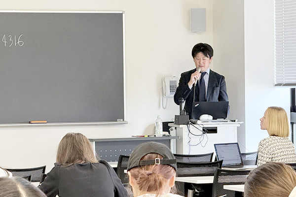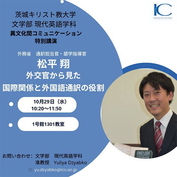 10月29日(水)の『異文化間コミュニケーション』(ジャブコ・ユリア准教授担当)の授業で、松平翔氏(外務省通訳担当官・語学指導官)を特別ゲストにお迎えし、「外交官から見た国際関係と外国語通訳の役割」についてご講演をいただきました。