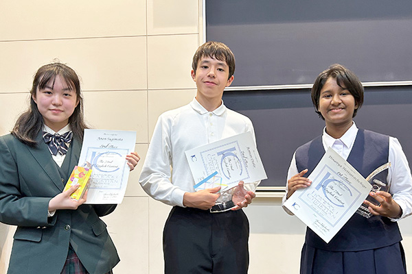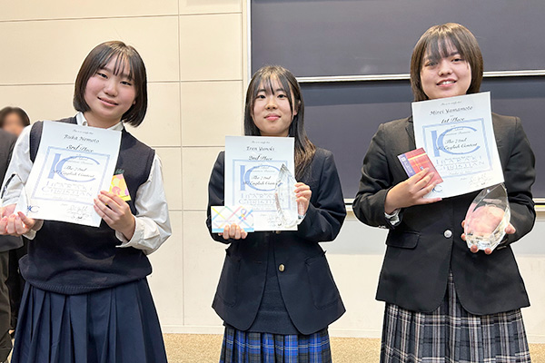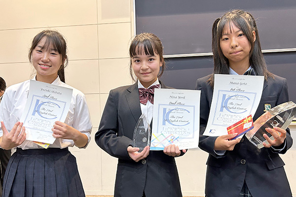 2025年10月17日(金)、本学園において『第72回茨城キリスト教学園英語コンテスト』が開催されました。今回は高校生11名、中学生35名の計46名が、高校プレゼンテーションの部、中学弁論の部、中学ストーリーの部の3部門に分かれて日頃の英語力を競いました。 優れた発表を行った参加者には、賞状、クリスタルトロフィー、賞品が授与されました。各部門の入賞者は以下のとおりです(敬称略)。