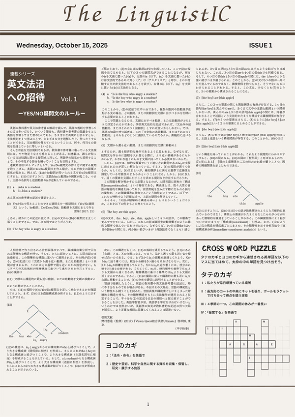 現代英語学科の三輪健太ゼミが今年度から取り組んでいる言語学新聞『The LinguistIC』の記念すべき第1刊が10月15日に刊行されました(3ヶ月に1回刊行予定)。