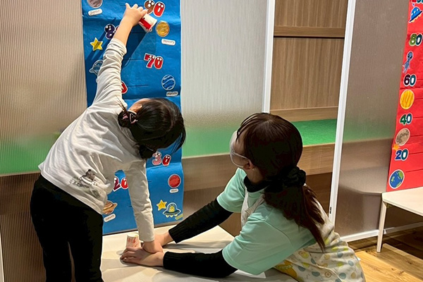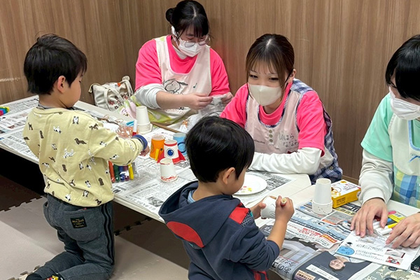 製作コーナーでは、幅広い年齢の子どもたちが学生と一緒に活動を楽しんでいました。紙コップロケットでは、一番高いところまで飛ばそうと挑戦する姿が見られました。