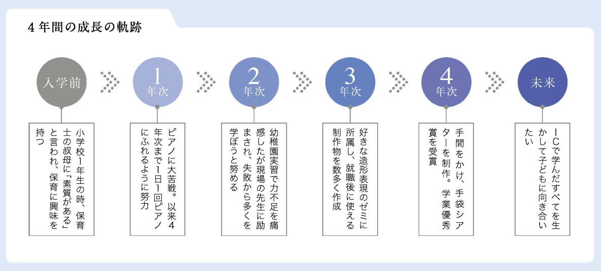 2年次の幼稚園実習での責任実習は、細かく保育指導案を作成して臨んだものの、子どもたちの興味を引き出せませんでした。力不足を感じて落ち込む私を立ち直らせてくれたのは、実習中の園児との様子を見てくれていた先生の「今日は思うようにいかなくても、保育者としての適性があると思う」という一言。その励ましを信じ、好きな造形表現はもちろん、その他の科目も納得がいくまで取り組み、失敗からも学び取ろうと保育士になる意欲を高めていきました。