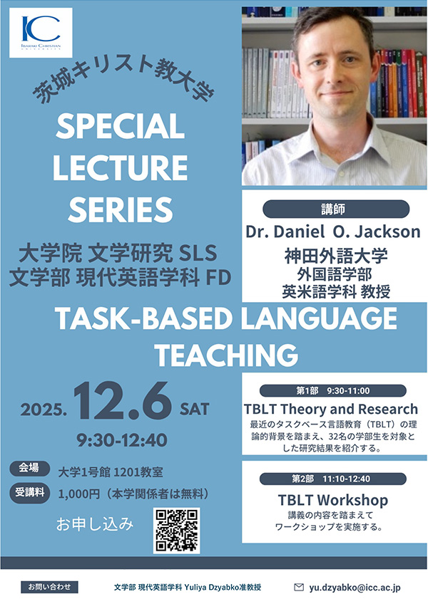 今回のSpecial Lecture Series(SLS)は、神田外語大学外国語学部英米語学科教授であるDaniel O. Jackson博士をお招きし、タスクベース言語教育(TBLT)の理論と実践についてお話しいただきます。