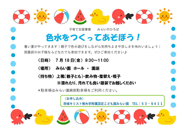 茨城キリスト教大学附属認定こども園 みらい園子育て支援事業「色水をつくってあそぼう!」のご案内