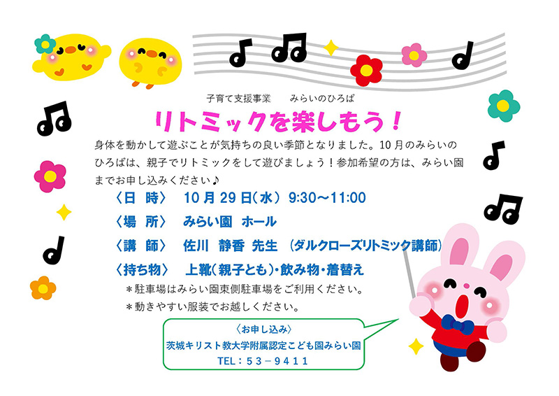 茨城キリスト教大学附属認定こども園 みらい園子育て支援事業「リトミックを楽しもう!」のご案内
