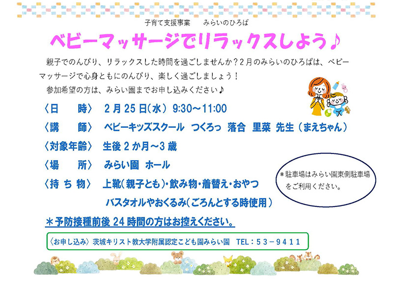 茨城キリスト教大学附属認定こども園 みらい園子育て支援事業「ベビーマッサージでリラックスしよう♪」のご案内
