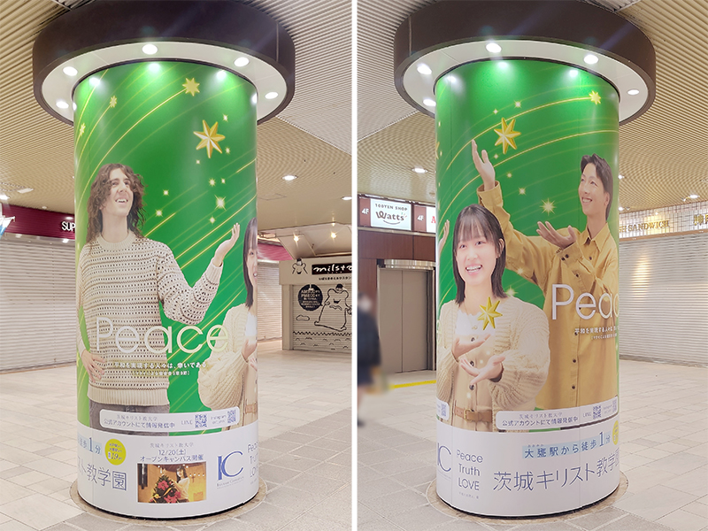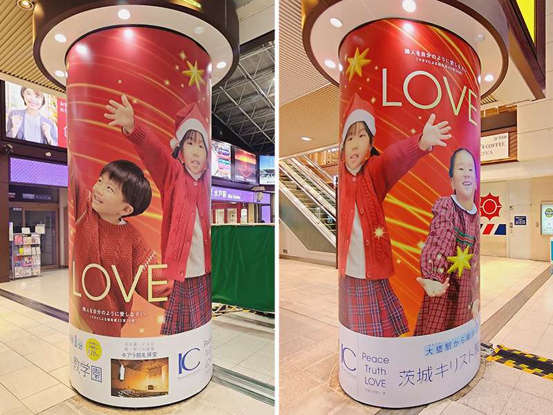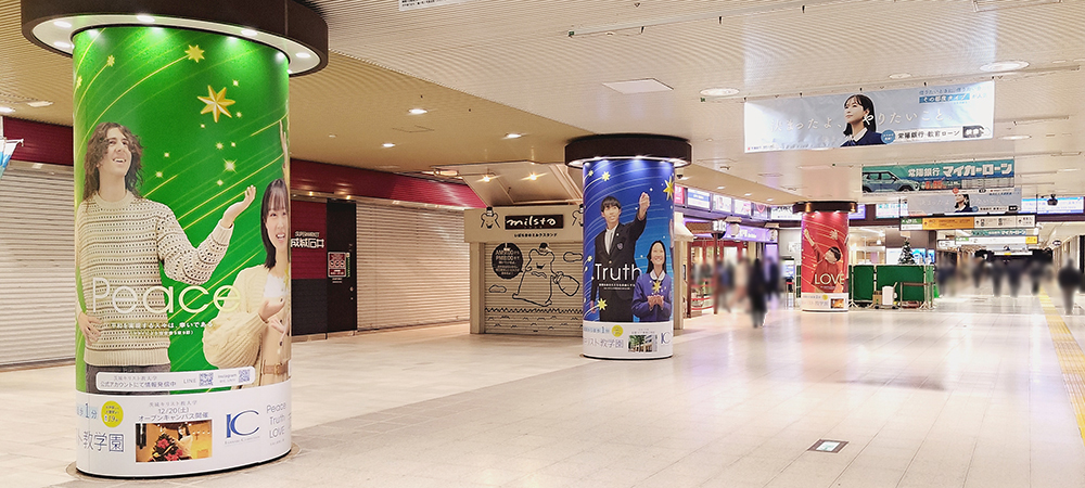 水戸駅に学園アドピラー(クリスマスバージョン)が掲出されました。【本記事】