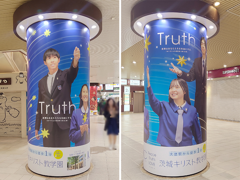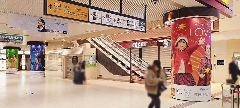 12月1日から31日までの間、水戸駅改札前の3本の柱に、認定こども園、中学校・高等学校、大学の広告を掲出しています。