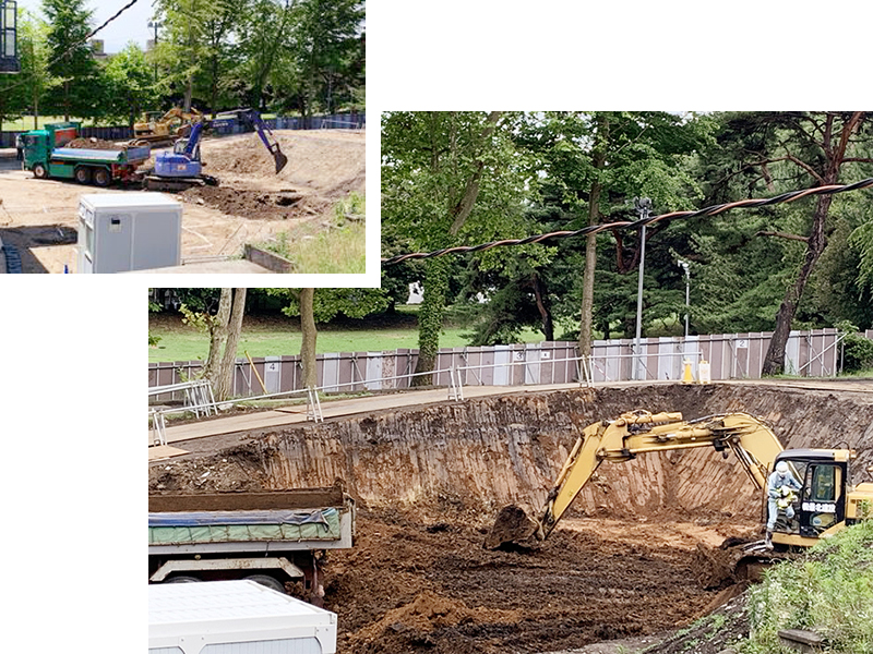 緑と新校舎…ふたつが同時に目に映ると、改めて「森の中の校舎」ができるのだということを実感します。 工事現場の向こうのグラウンドでは、生徒が体育の授業をしている姿も見えます。