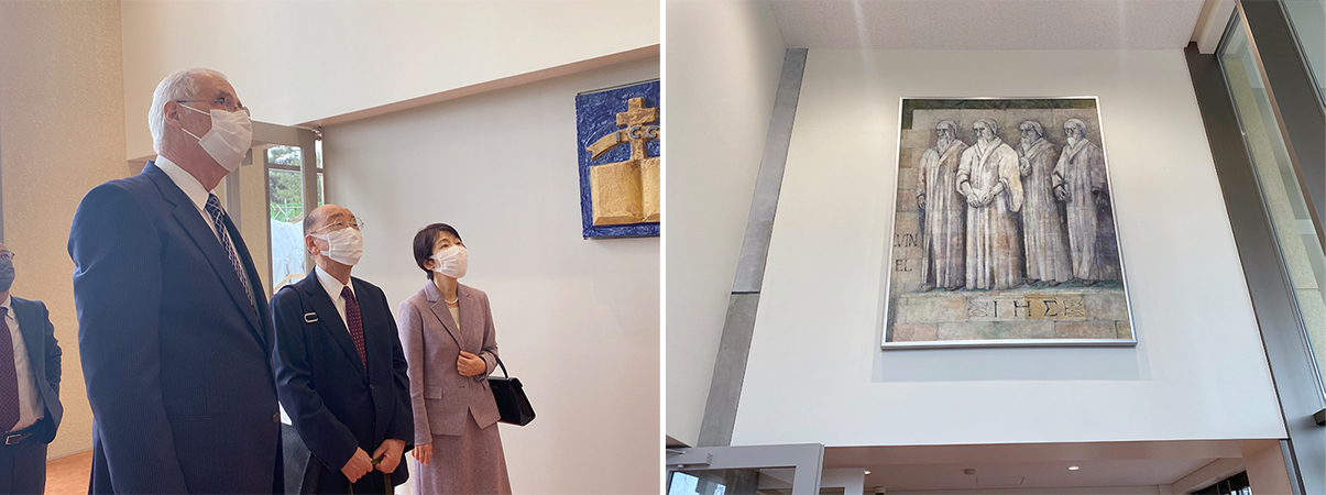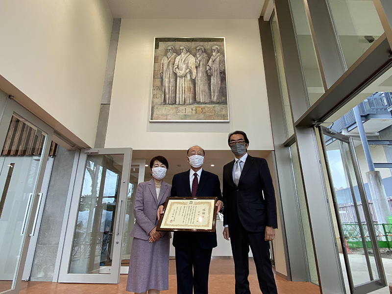 竣工式前には、今回の新校舎建築にあたり絵画作品を寄贈してくださった、本高校OBでもある村田さまに感謝状の授与と新校舎案内をさせていただきました。