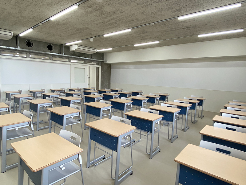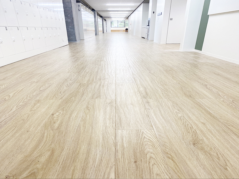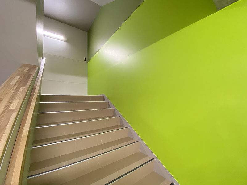 新校舎は、色(ex.階段の壁)や素材(むき出しのコンクリートや木のような床[この床、実際はビニールですが])で“自然”を体現しています。コンクリートの柱などはすべて面取りされており、安全性も同時に担保しています。