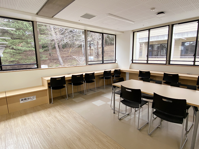 学園の木々に囲まれながら勉強できるラーニングエリアです。本校の生徒たちは放課後になると、職員室などの壁側に設けられたスペースで勉強している姿が印象的です。そんな姿を見ていた私たちは、より多くのラーニングエリアを作ろうと思っていました。