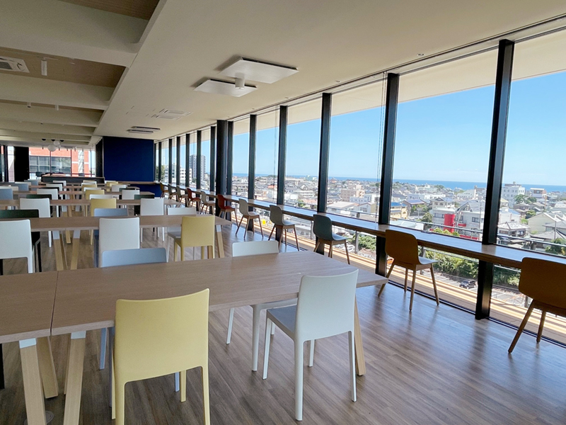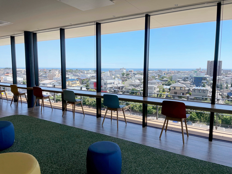 40メートル連なる全面ガラスの窓からは太平洋が望めます。外資系のオフィスを思わせる開放感にあふれた空間で、自由な発想で新しい学びが始まります。海に向いた窓側にはUSB等完備の落ち着いたスタディスペースのカウンターが配置されています。