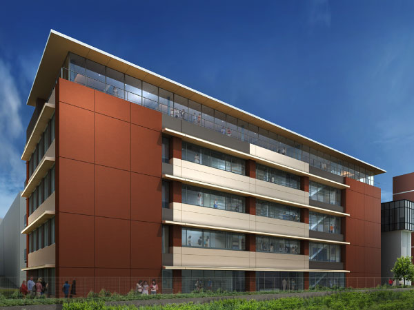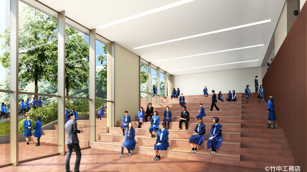 陽の光と緑にあふれる高校新4号館は、森へと続くシオンの丘(学園創設の地)の傾斜に沿って建つ4層の建築。全館ICT教育に対応しています。教室14室と、特徴的な階段型ホールが配置されます。