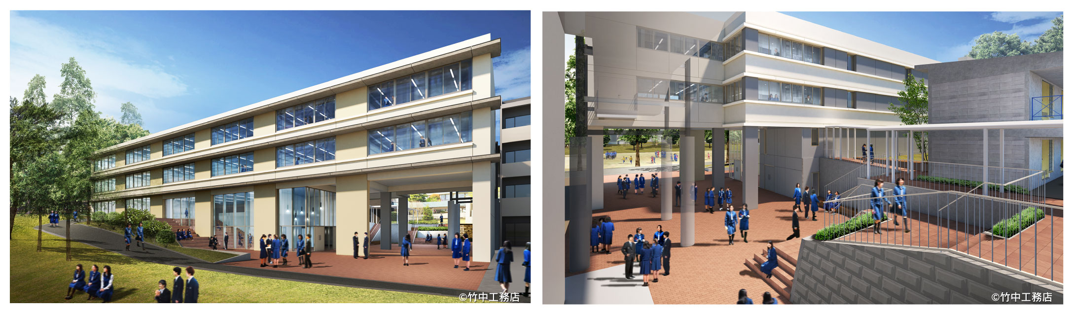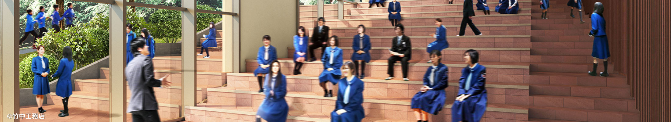 また、中庭を通って、グラウンドにも、他の校舎にもつながる校舎です。ここに学ぶ生徒が、仲間たちと、教員と、社会と、地域と、そして世界と深くつながっていく、自主性に富んだ豊かな学びの環境が整えられています。