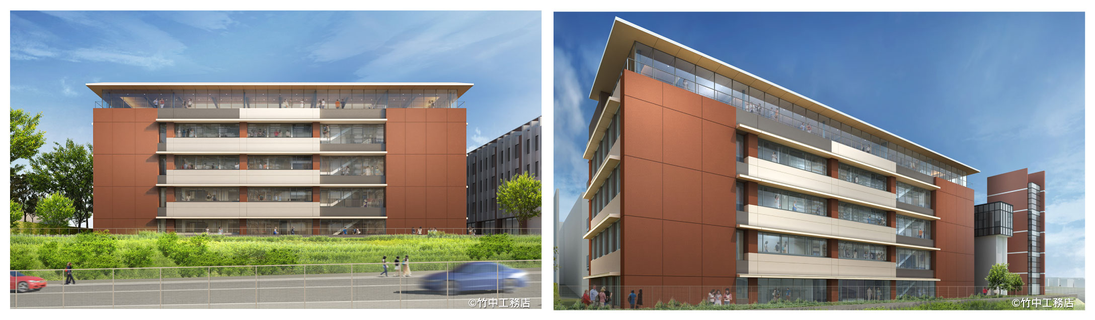 大学新1号館は地上5階建て。JR大甕駅西口(学園口)前を通る南北アクセス道路に面し、常磐線からもその広がりが良く見える場所に建設されます。全館ICT・BYOD対応です。