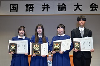 国語弁論大会が行われました。クラスの代表者が全校生徒の前で発表し、順位を競いました(残念ながら1年1組は学級閉鎖中のため発表はありませんでした)。審査の結果、テーマ、展開、論理性、演出、態度などから総合的に選ばれた1位から4位までが入賞し、賞状と楯を授与されました。