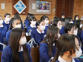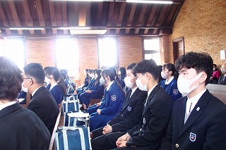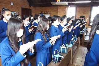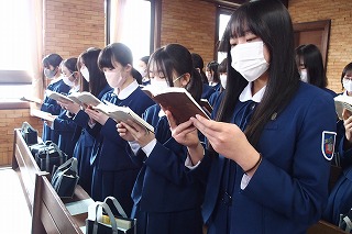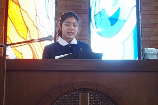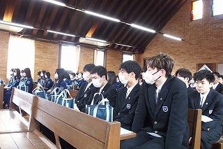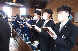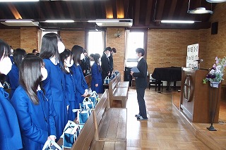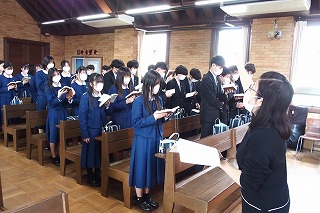 卒業式を明日に控え、中学3年生たちの卒業記念礼拝を行いました。今までの中学校生活で歌ってきた思い出の讃美歌を歌い、そして代表生徒が3年間の思いを込めた感話を行いました。