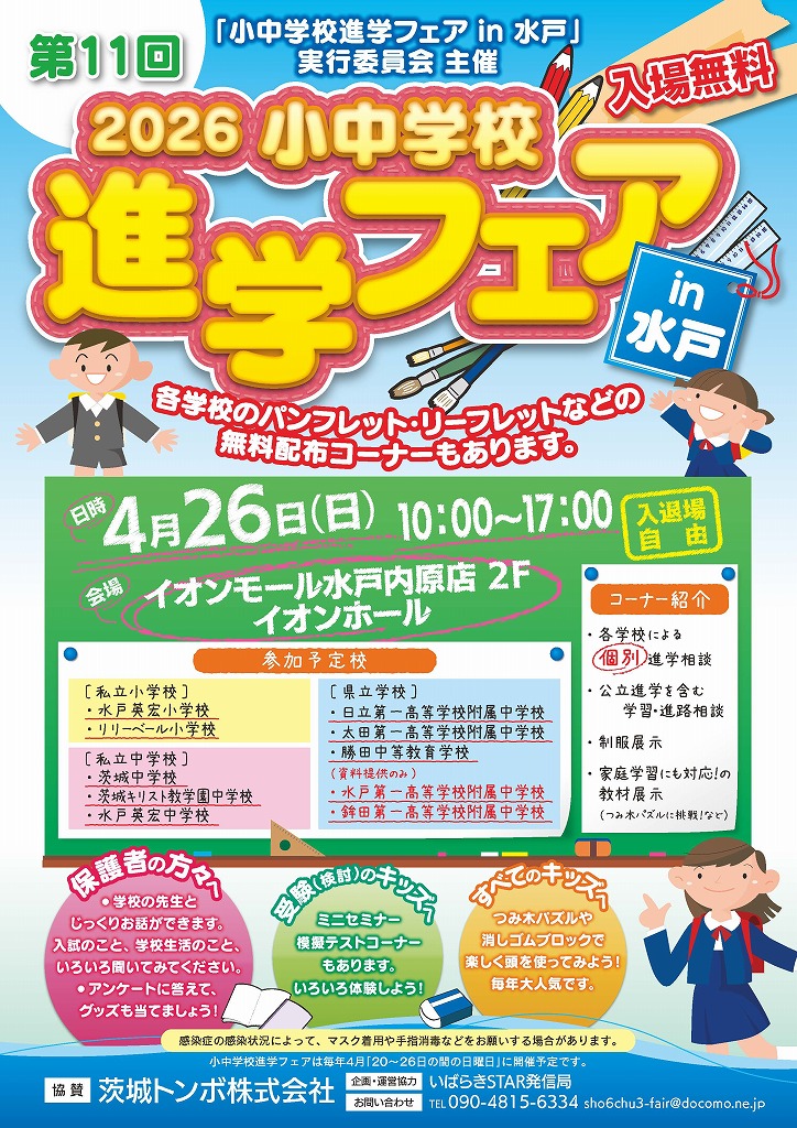 4/26(日)にイオンモール水戸内原店 2Fイオンホールにおいて『第11回 2026 小中学校進学フェアin 水戸(企画・運営協力:いばらきSTAR発信局 協賛:茨城トンボ株式会社)』が開催されます。 本校ももちろん参加します!今後の進学先の選択肢に「茨城キリスト教学園中学校」を入れてみませんか? 各学校のパンフレット・リーフレットなどの無料配布の他、進学に際しての教育内容や学費などの細かな話も本校の教員が個別で質問にお答えします。 是非奮ってご参加ください!