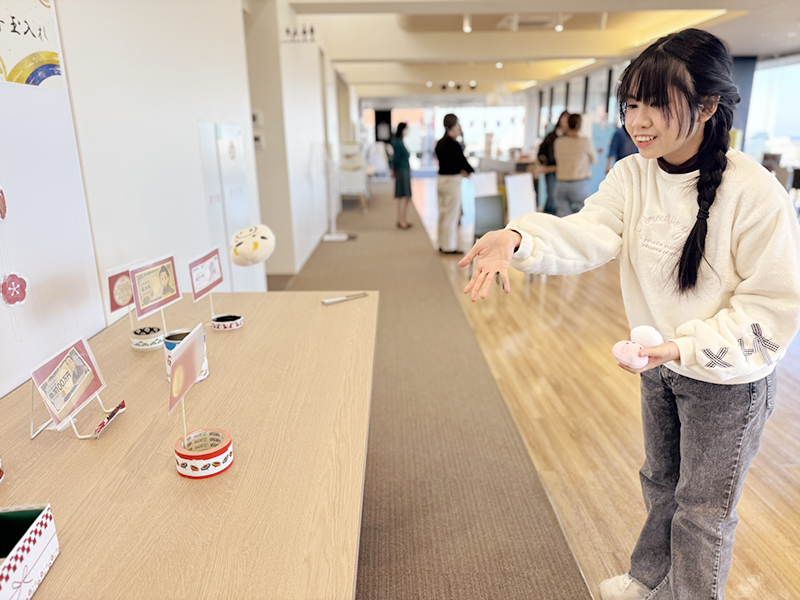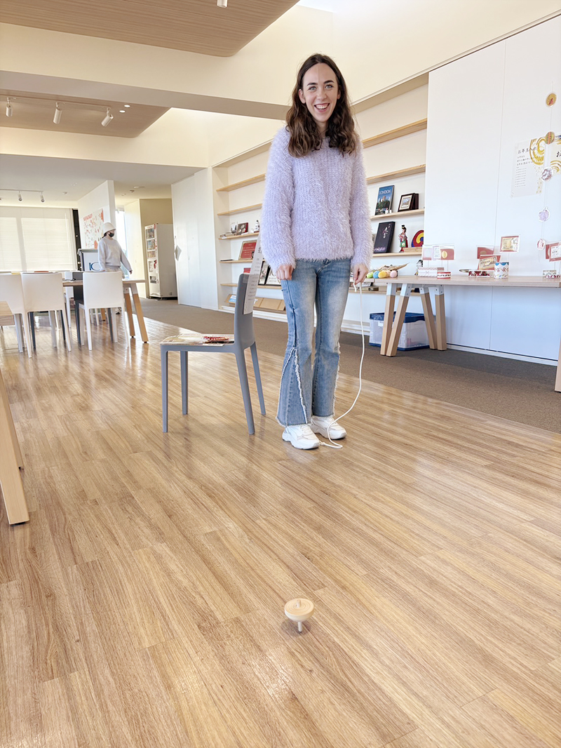 投扇興(センタースタッフのマリコさんとIC-Buddyが英語でゲーム内容を説明中)