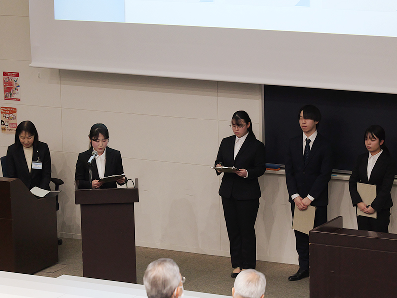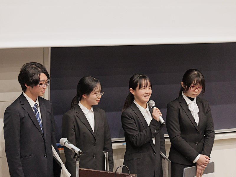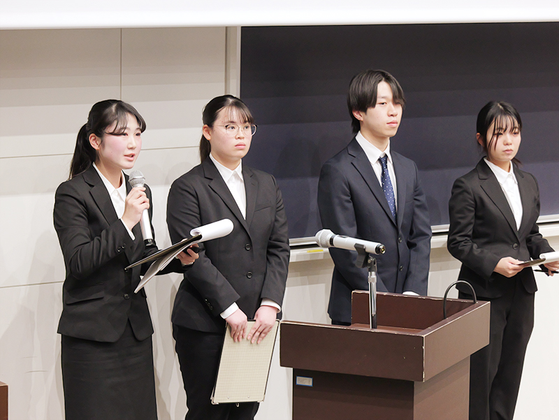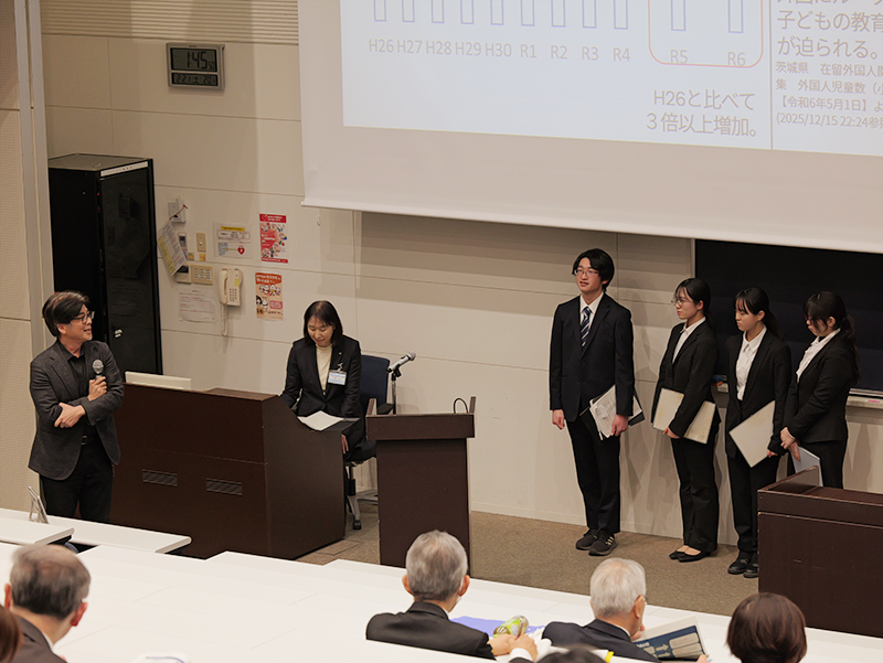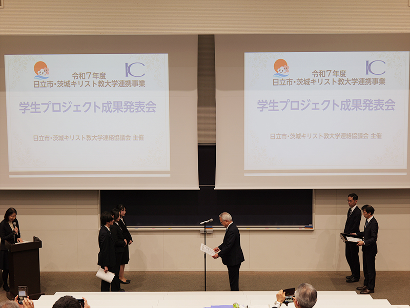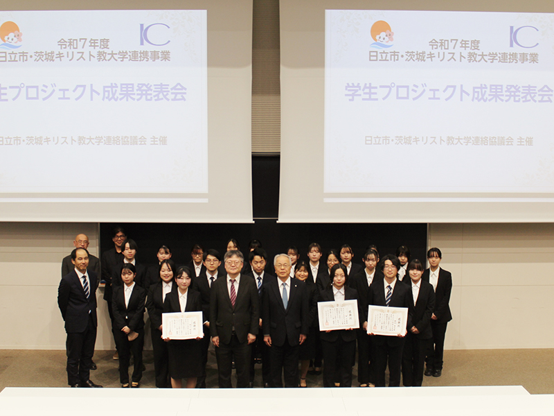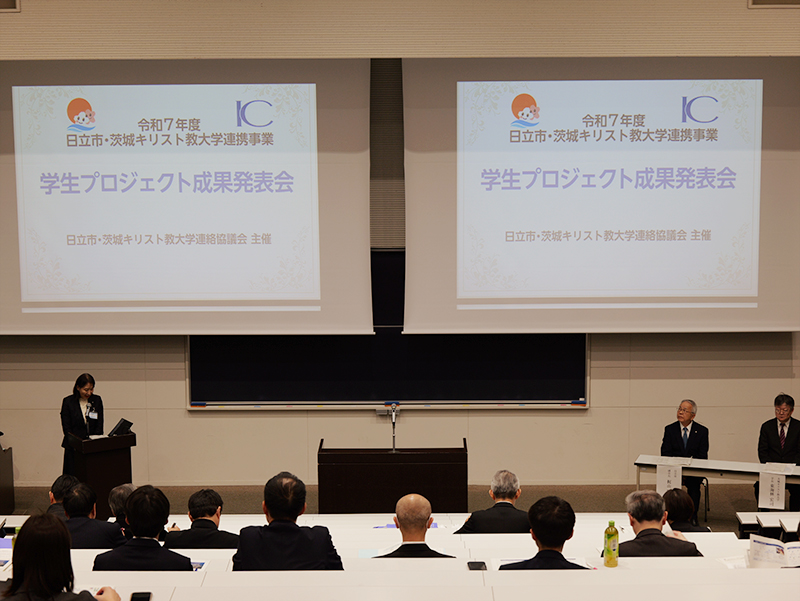 「学生プロジェクト」とは、日立市と茨城キリスト教大学連携事業の一環として、平成20年度から実施しているもので、地域の課題解決や活性化方策などに関するテーマをもとに、学生が調査研究を行う取り組みです。 2025年度は、3つのグループがプロジェクトに応募し、それぞれのテーマで調査研究を進めました。 当日は、日立市副市長をはじめとする市の関係の皆さまや地域住民の方がご来場し学生の提案を聞いていただきました。