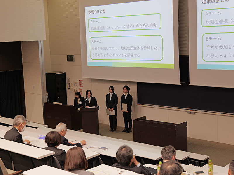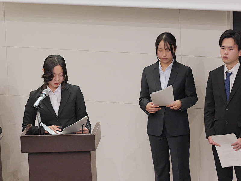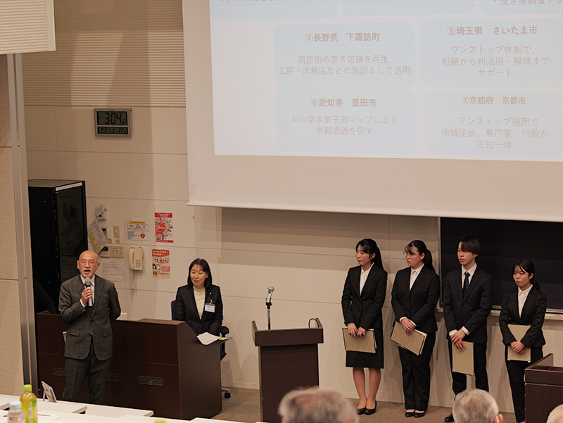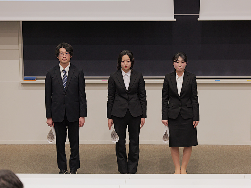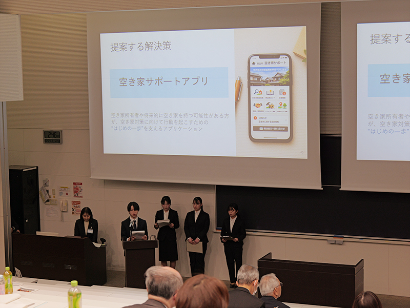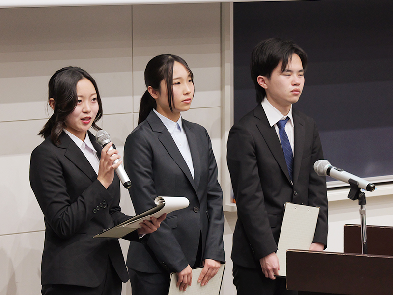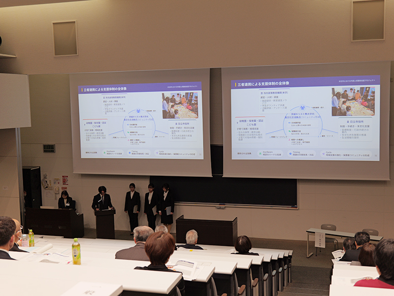 「学生プロジェクト」とは、日立市と茨城キリスト教大学連携事業の一環として、平成20年度から実施しているもので、地域の課題解決や活性化方策などに関するテーマをもとに、学生が調査研究を行う取り組みです。 2025年度は、3つのグループがプロジェクトに応募し、それぞれのテーマで調査研究を進めました。 当日は、日立市副市長をはじめとする市の関係の皆さまや地域住民の方がご来場し学生の提案を聞いていただきました。