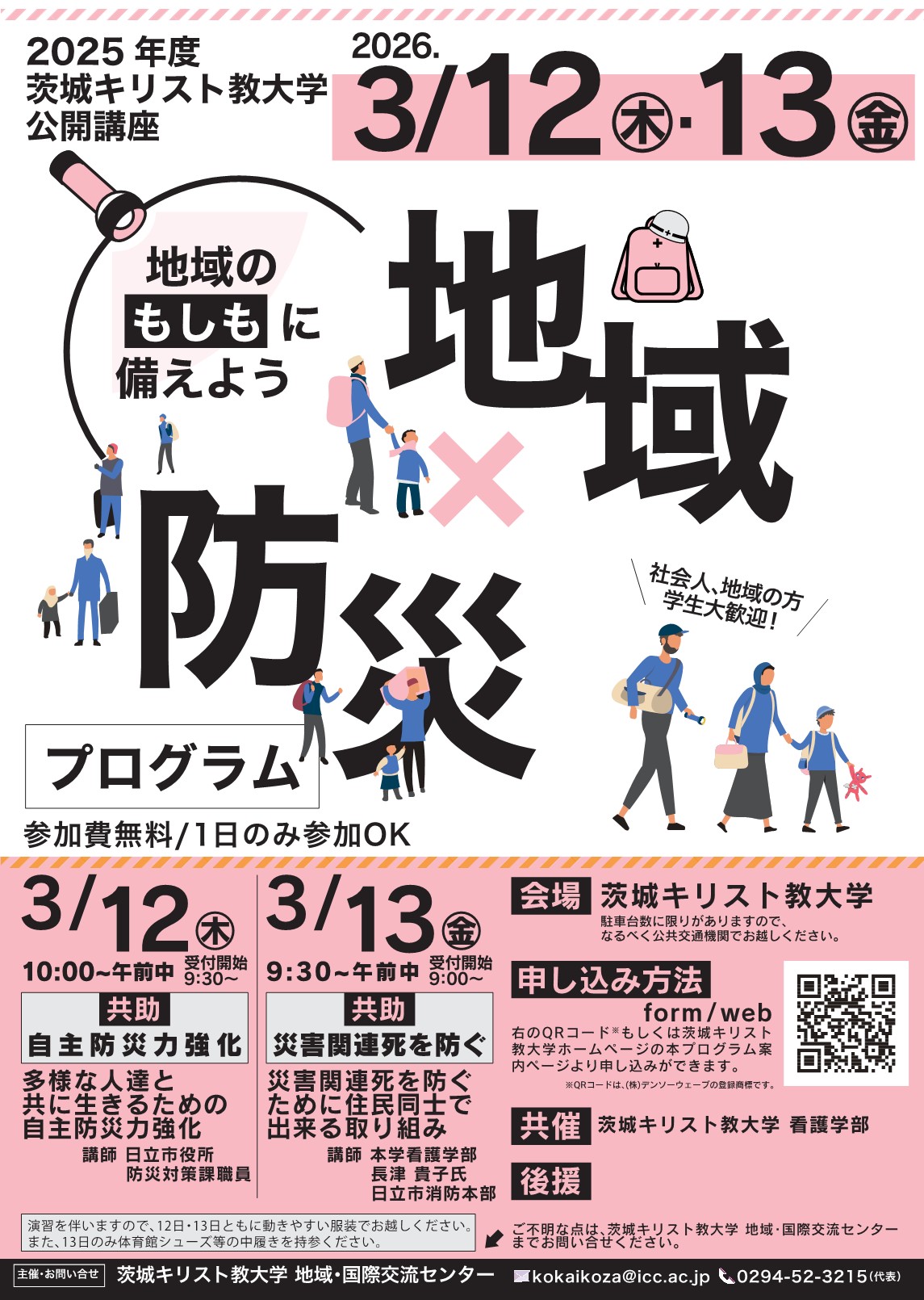 本学では、昨年度に引き続き、日立市と本学看護学部との連携事業として、「多様な人達と共に生きるための自主防災力強化 (共助)」と「災害関連死を防ぐために住民同士で出来る取組 (共助)」をテーマに防災講座を開催いたします。初めて受講される方だけでなく、昨年度に参加してくださった受講者にも振り返りとステップアップできるよう、新たな知識・体験を得られるような内容で開催いたします。