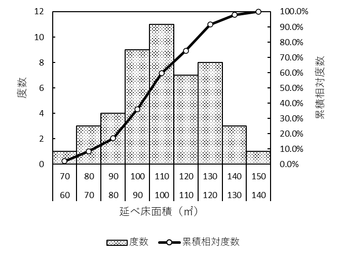 | 境界値 | 階級値 | 度数 | 相対度数 | 累積度数 | 累積相対度数 |