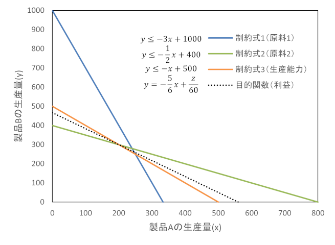 で表すことができる。この式を目的関数という。同様に原材料と生産能力による制約条件を式で表すと