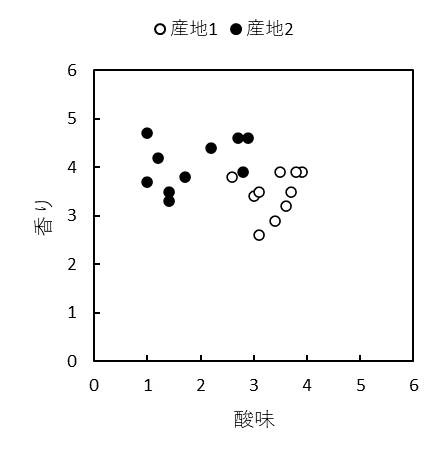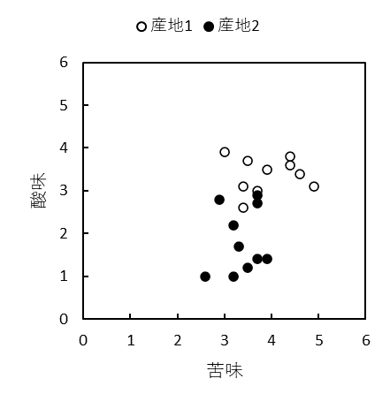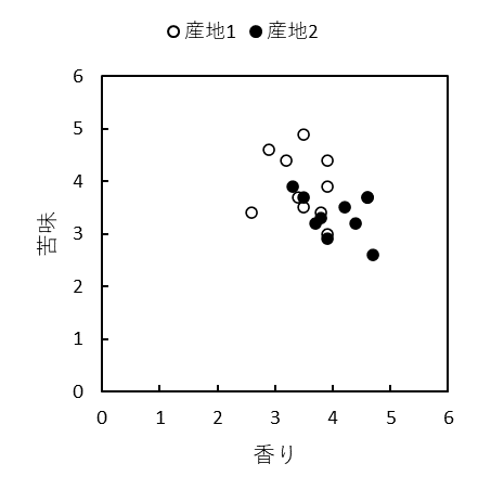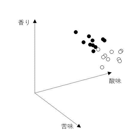 | No. | 苦味($x_1$) | 酸味($x_2$) | 香り($x_3$) | 生産地($y$) |